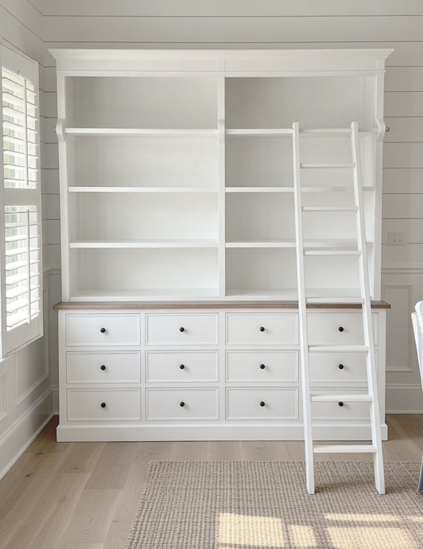Listed is this timeless Vivid white library / display unit with ladder. Display as a library unit in a study, or use as a display unit in your living area, this unit will give an elegant touch to any home.