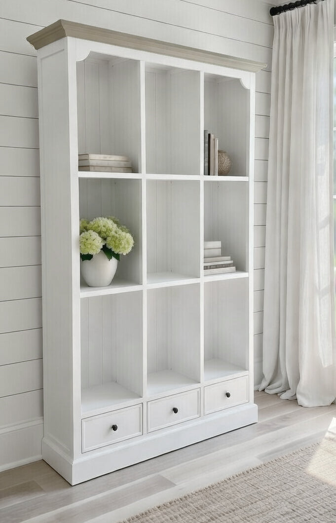Display as a library unit in a study, or use as a display unit in your living area, this unit will give an elegant touch to any home. Made from versatile grey paulownia head board, and an antique white body.