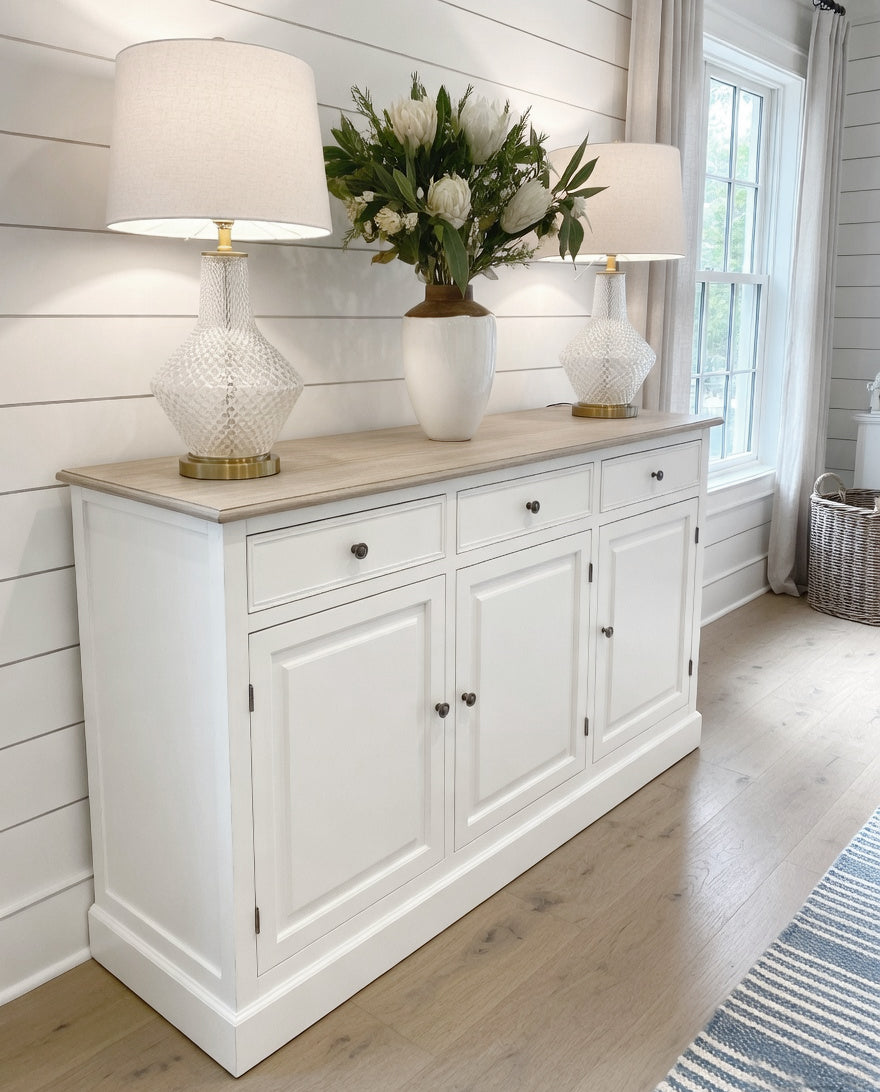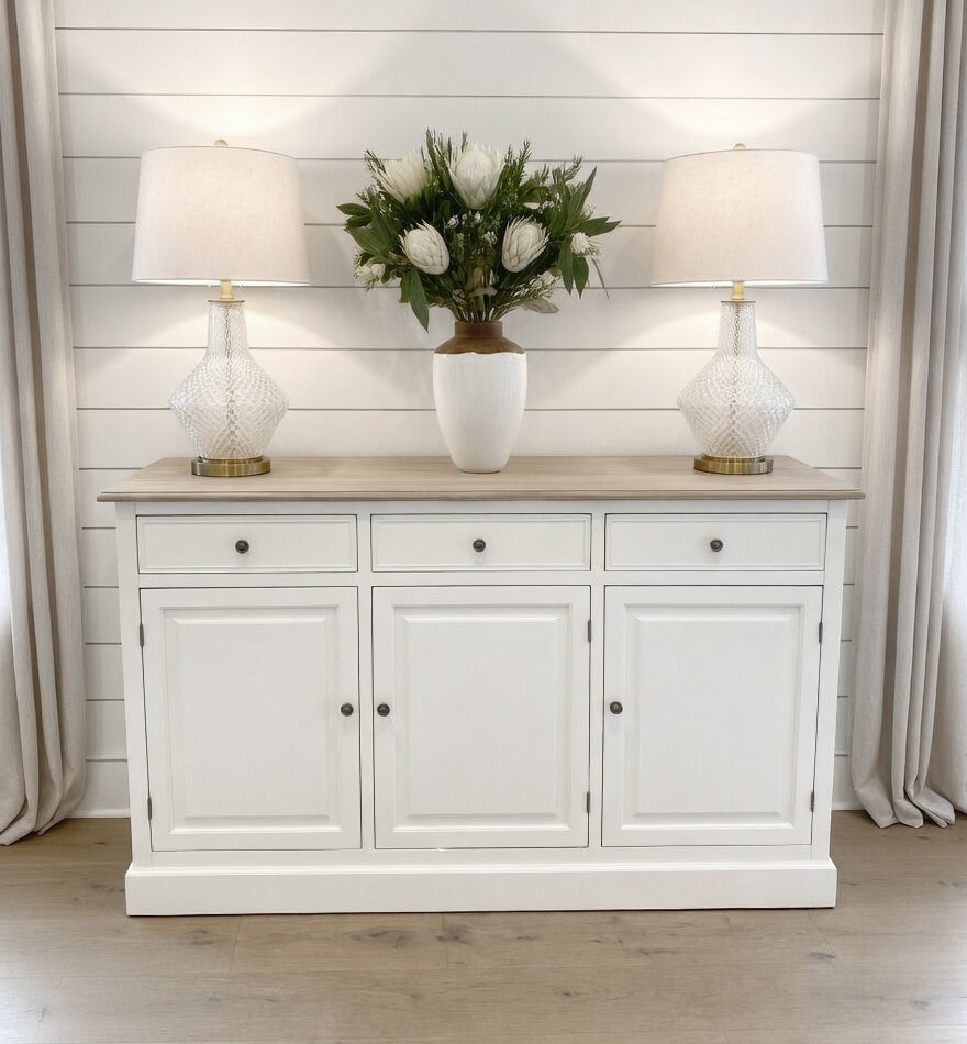 This stunning unit would look perfect in any home. Finished in beautiful antique white, featuring a grey washed look timber top, this buffet looks great with any new or existing furniture due to its classic 'found' look. A perfect look for a kitchen or dining room.