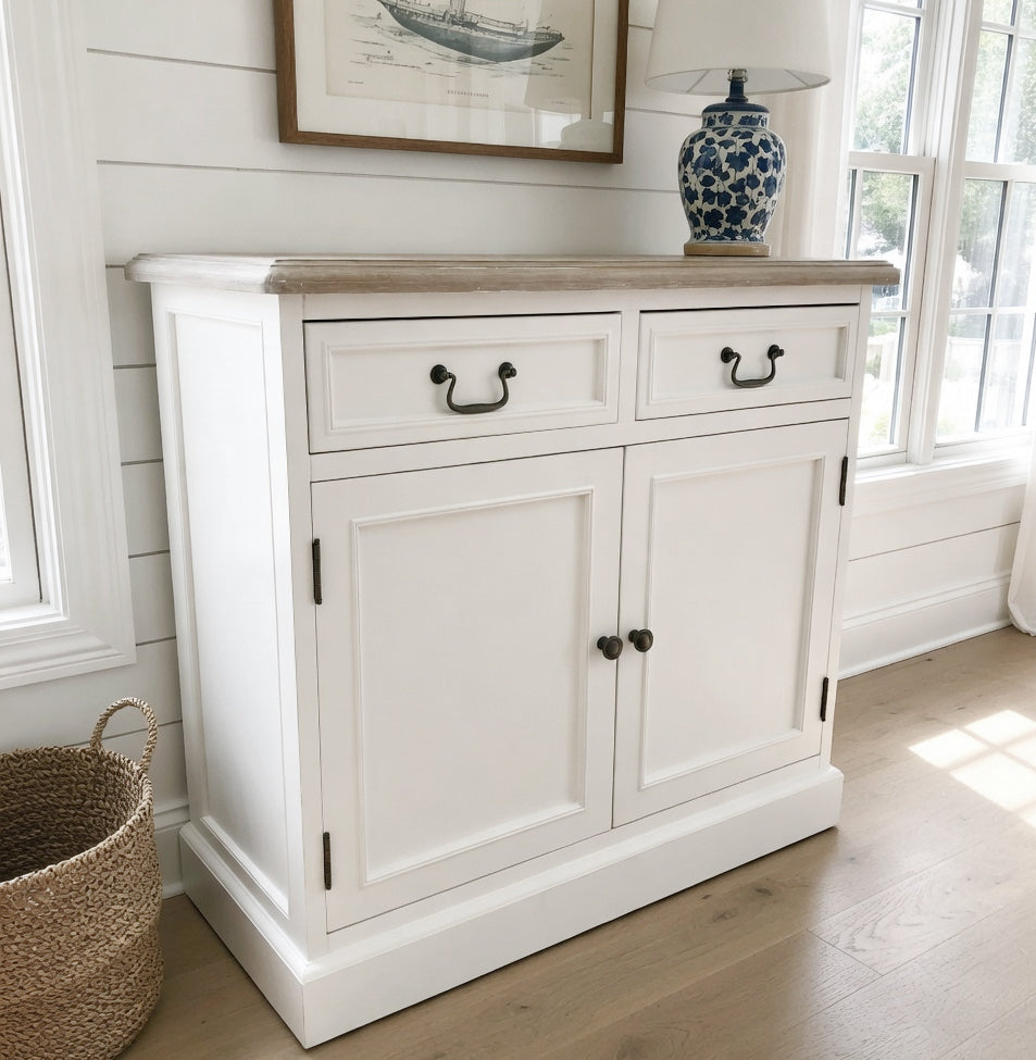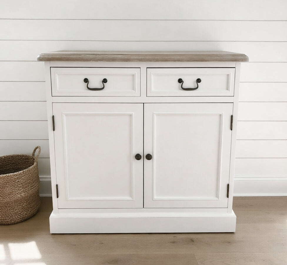 This unit is finished in classic white, featuring a grey wash timber veneer top, and looks great with any new or existing furniture due to its classic 'found' look. Versatile in design, this unit would look great in any kitchen or lounge room.