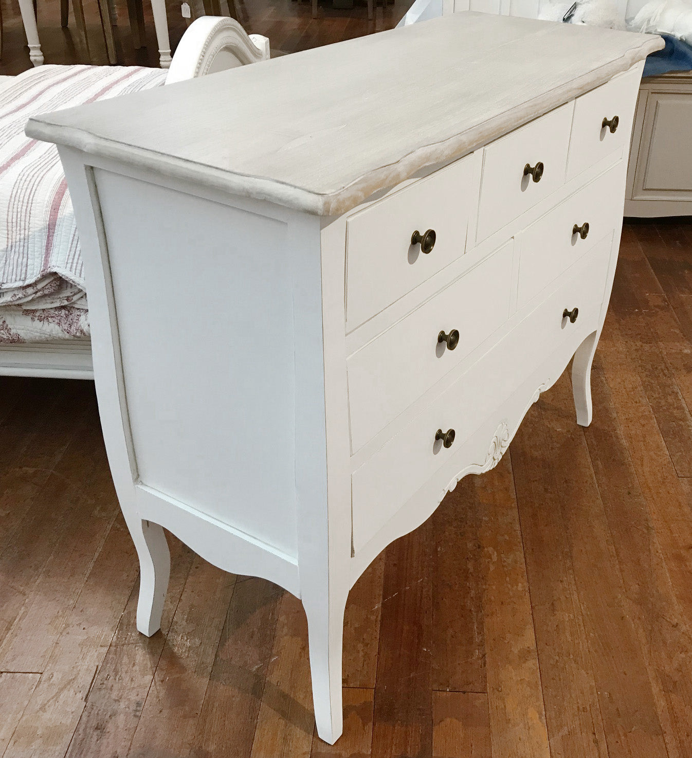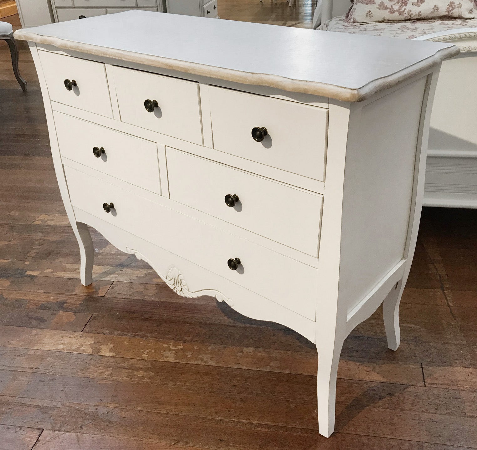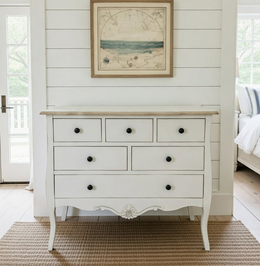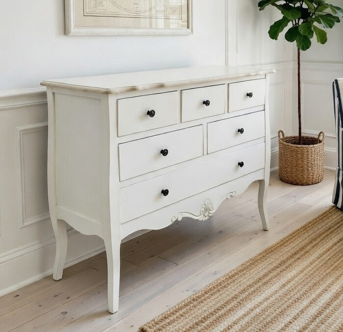 This stunning chest would look perfect in any home. This unit is made from Paulownia timber and has a grey and white wash top with white base. This finish looks great with any new or existing bedroom furniture due to its classic 'found' look. Item comes fully assembled, and is of basic construction as per French Provincial style.