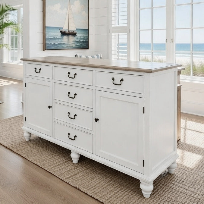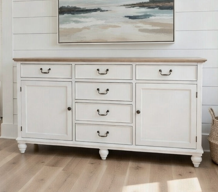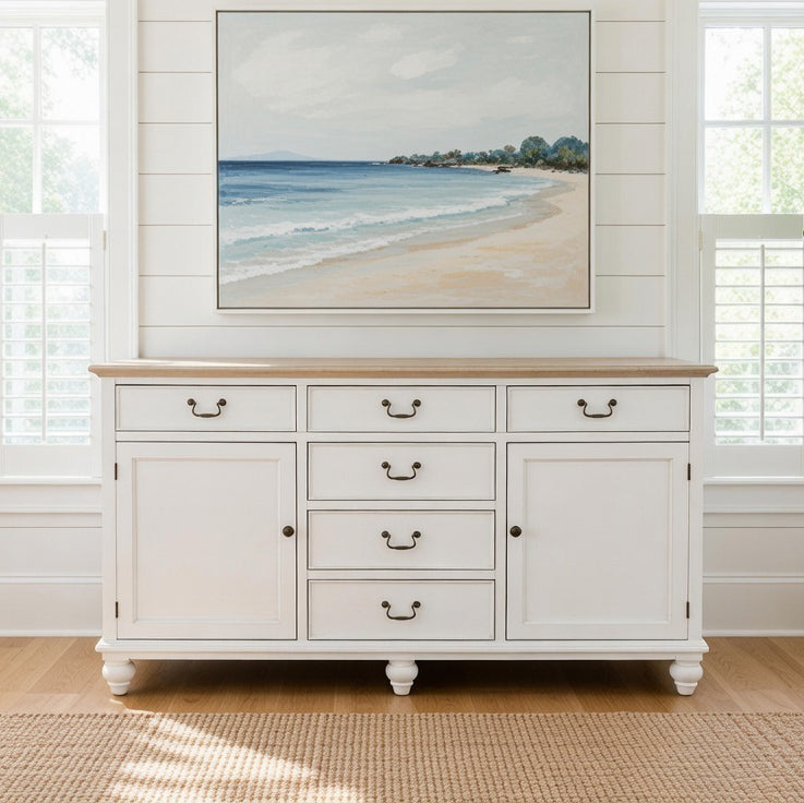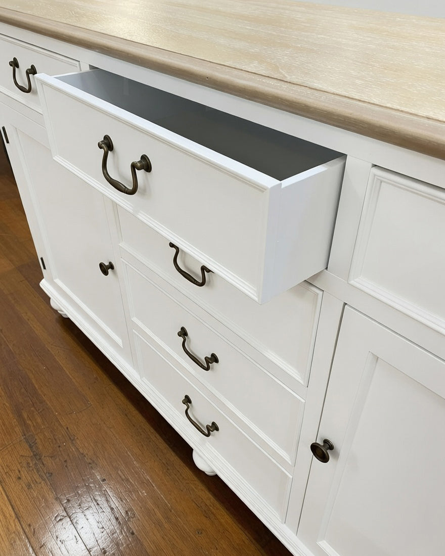 This stunning unit would look perfect in any home. Finished in beautiful vivid white, featuring a 'washed' veneer timber top, this buffet looks great with any new or existing furniture due to its classic look. A perfect look for a kitchen or dining room.